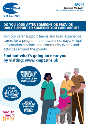 Don’t forget to sign the KMPT carers’ pledge (on the day) to recognise carers for the difficulties they may experience, to respect them for all they do, to work with them in partnership and to support and promote better inclusion, and raise awareness amongst colleagues.